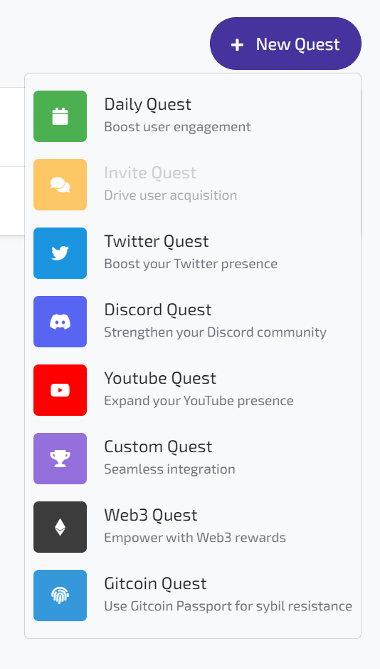 You find Gitcoin Quests under 'New Quest' on the right hand side of your dashboard.&#x20;